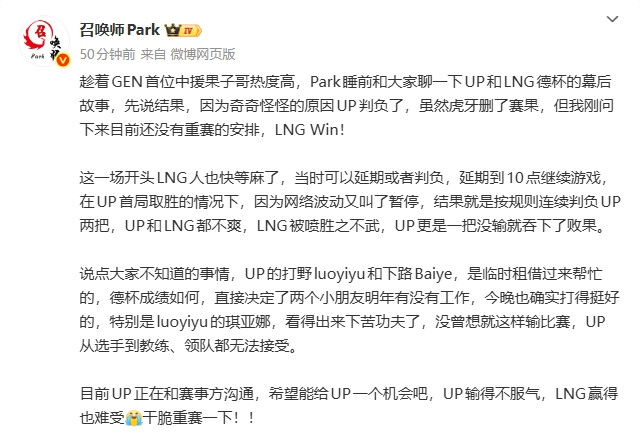 趁着GEN首位中援果子哥热度高,Park睡前和大家聊一下UP和LNG德杯的幕后故事,先说结果,因为奇奇怪怪的原因UP判负了,虽然虎牙删了赛果,但我刚问下来目前还没有重赛的安排,LNGWin!