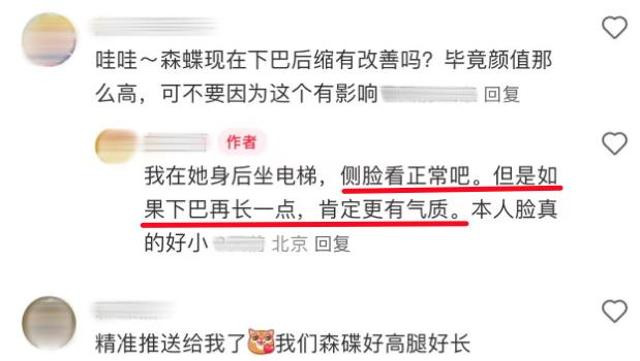 对此,网友回复写道:“我在她身后坐电梯,侧脸看着正常吧。但是如果下巴再长一点,肯定更有气质”。也就是说,森碟下巴后缩的问题对她的气质还是有一定影响的。