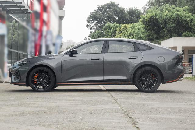 侧面造型方面,车顶采用了溜背式造型,线条感显得比较干练;腰线采用了分段式设计,点缀出了车身侧面的层次感;门把手则是内凹式设计,能够起到略微降低风阻的作用;轮眉和侧裙部分设计有隆起的筋线,凸显了肌肉感;轮毂采用了多幅式熏黑造型,搭配红色卡钳凸显了运动气息。
