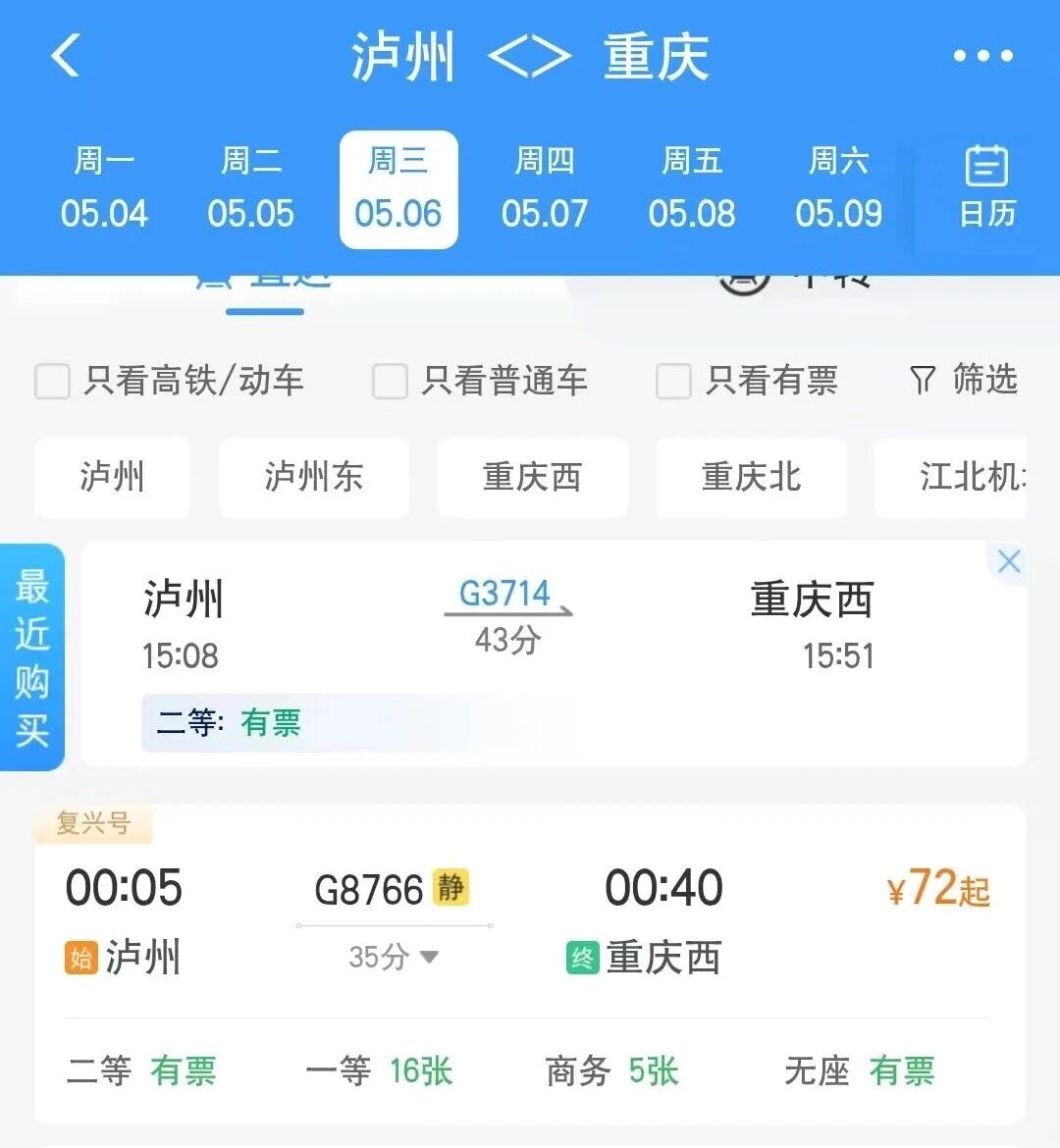 5月6日凌晨加开4趟乐迷列车具体如下:加开泸州至重庆方向2趟,G8766次(泸州00:05-重庆0:40)和G8728次(经停,00:39出发);加开泸州至宜宾方向2趟,C5583次()经停,00:21出发)和G4433次(经停,02:24出发)。